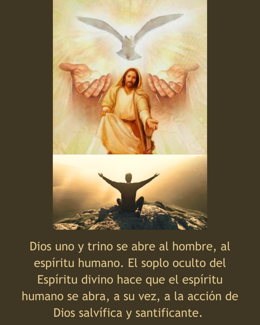 🕊️Por este Espíritu, que es el don eterno, Dios uno y trino se abre al hombre, al espíritu humano. El soplo oculto del Espíritu divino hace que el espíritu humano se abra, a su vez, a la acción de Dios salvífica y santificante.
