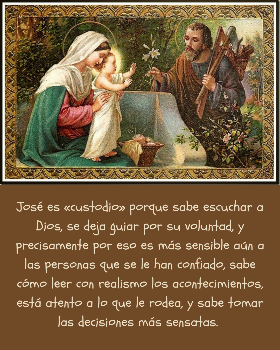 🔨Dios no quiere una casa construida por el hombre, sino la fidelidad a su palabra, a su designio; y es Dios mismo quien construye la casa, pero de piedras vivas marcadas por su Espíritu. Y José es «custodio» porque sabe escuchar a Dios, se deja guiar por su voluntad, y precisamente por eso es más sensible aún a las personas que se le han confiado, sabe cómo leer con realismo los acontecimientos, está atento a lo que le rodea, y sabe tomar las decisiones más sensatas.