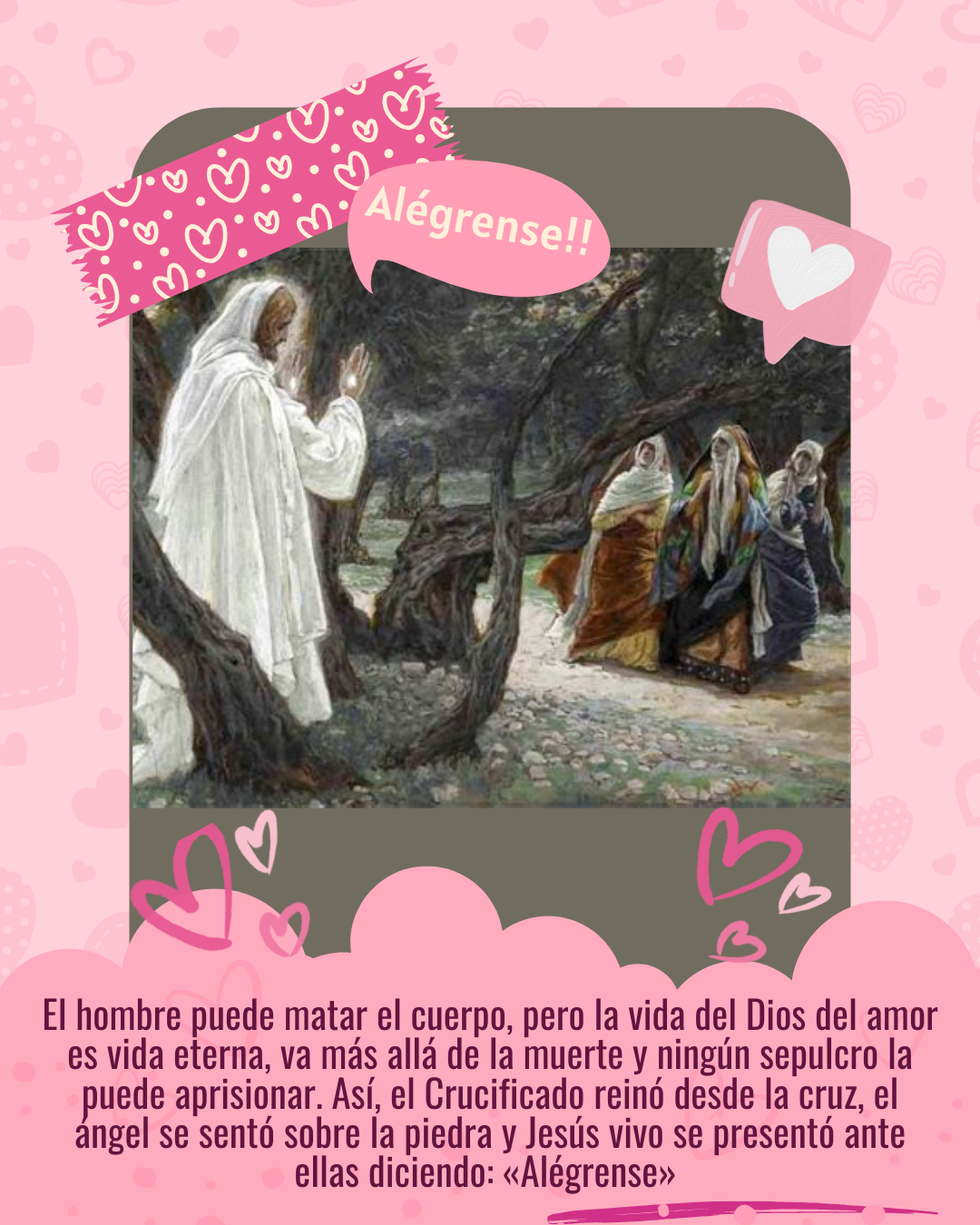 💕El hombre puede matar el cuerpo, pero la vida del Dios del amor es vida eterna, va más allá de la muerte y ningún sepulcro la puede aprisionar. Así, el Crucificado reinó desde la cruz, el ángel se sentó sobre la piedra y Jesús vivo se presentó ante ellas diciendo: «Alégrense» (Mt 28,9).