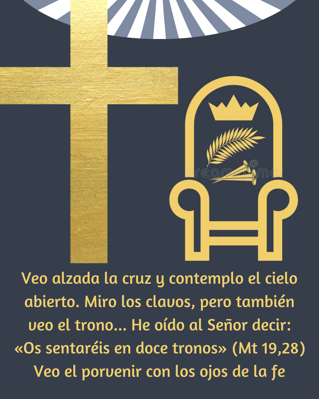 👑Yo veo, dice ella, la pasión, pero preveo también la resurrección. Veo alzada la cruz y contemplo el cielo abierto. Miro los clavos, pero también veo el trono... He oído al Señor decir: «Os sentaréis en doce tronos» (Mt 19,28) Veo el porvenir con los ojos de la fe.