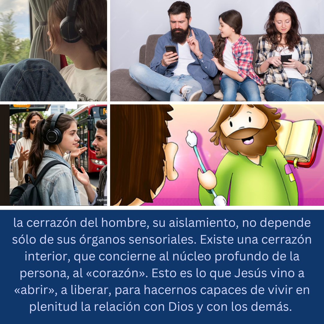 📢Pero todos sabemos que la cerrazón del hombre, su aislamiento, no depende sólo de sus órganos sensoriales. Existe una cerrazón interior, que concierne al núcleo profundo de la persona, al que la Biblia llama el «corazón». Esto es lo que Jesús vino a «abrir», a liberar, para hacernos capaces de vivir en plenitud la relación con Dios y con los demás.